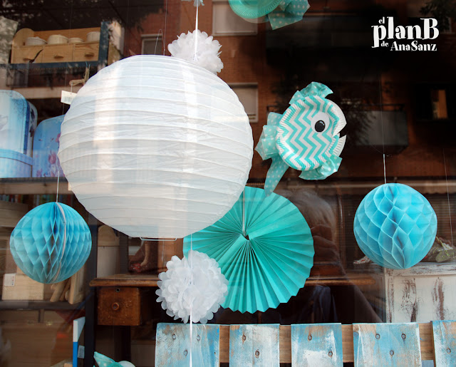 Peces y medusas se reparten por el espacio creado con unos palets pintados en blanco y azul que simulan las aguas un poco más alejadas de la costa, porque con manteles de plástico blancos y cuadritos de vichy turquesa-blanco simulé las olas que rompen en la playa con sus crestas de espuma blanca.